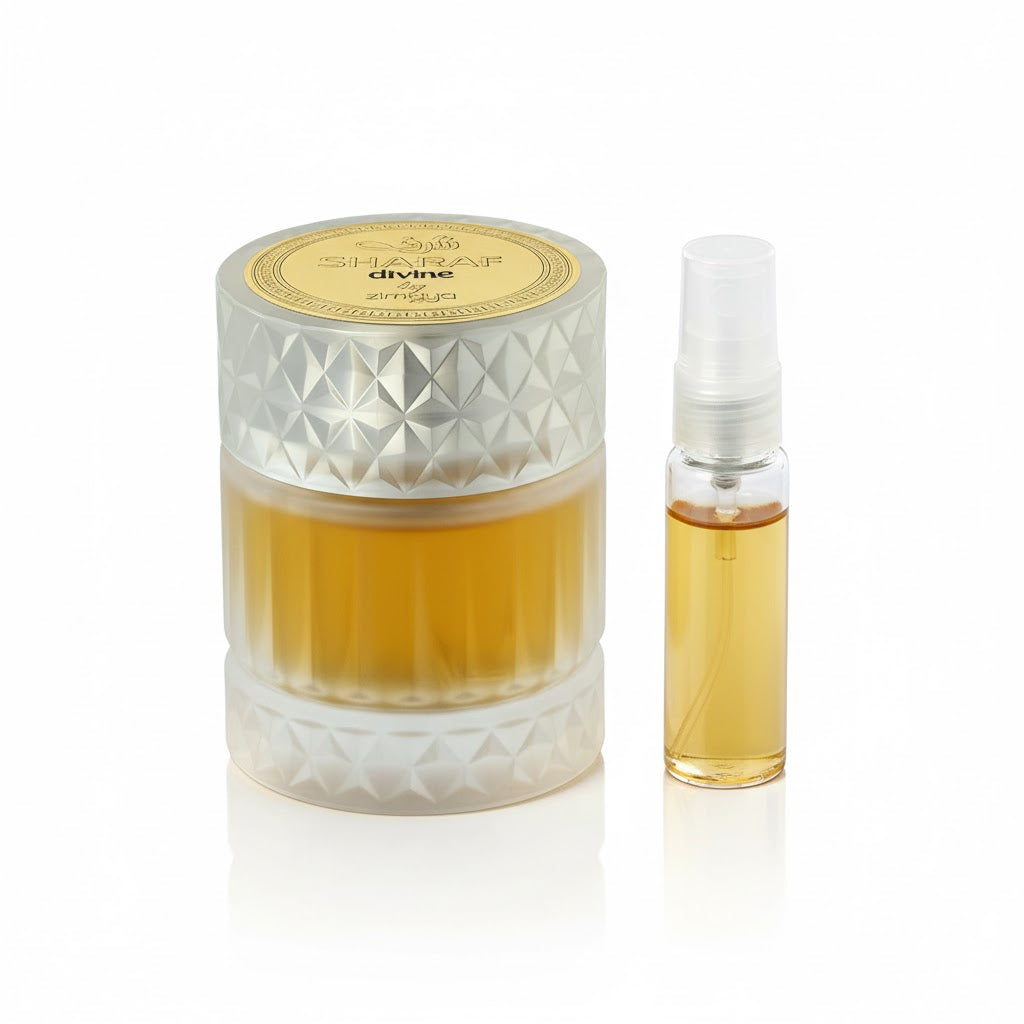 Zimaya Sharaf Divine is a luxurious unisex extrait de parfum that opens with sparkling bergamot, warm cinnamon and juicy raspberry, then unfolds into a rich heart of caramel, apple and rose, and finally settles into a deep base of tonka bean, cognac, moss, vanilla and amber. Available as 2 ml, 5 ml and 10 ml decants at decants.ie for delivery in Ireland.
